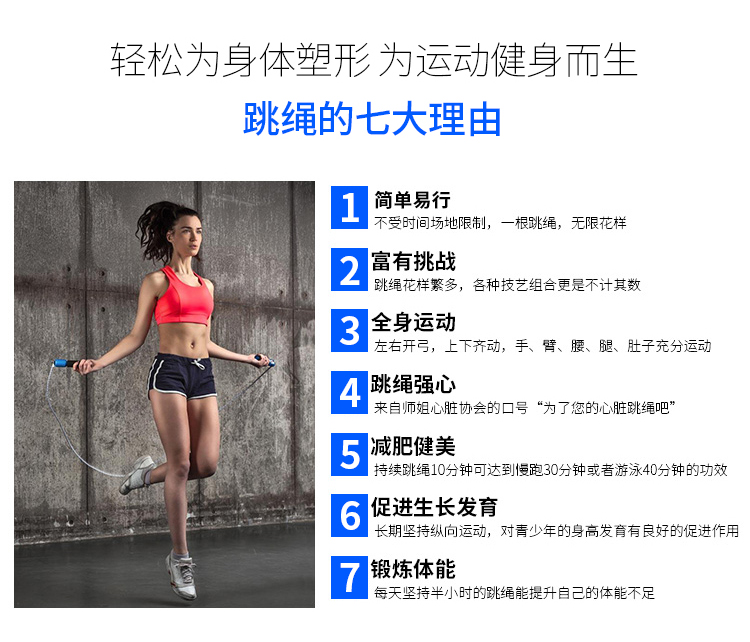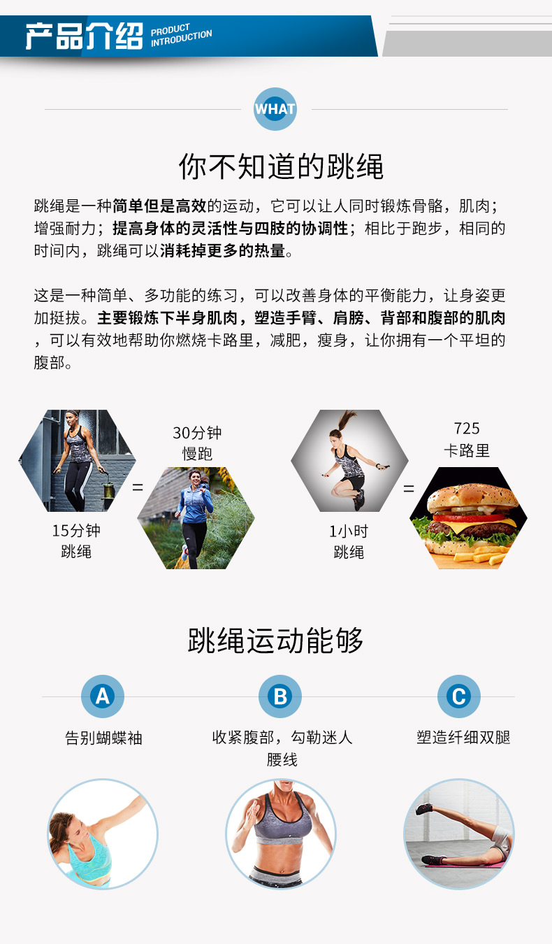 跳繩是一種簡單但是高效的運動,它可以讓人同時鍛煉骨骼,肌肉增強耐力;提高身體的靈活性與四肢的協調性;相比于跑步,相同的時間內,跳繩可以消耗掉更多的熱量。